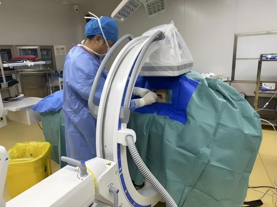 临床上,老年人椎体压缩骨折多采用经皮椎体成形术(PVP)或后凸成形术(PKP)治疗,通过背部建立铅笔粗细通道、注入骨水泥稳定骨折、缓解疼痛。然而,这一常规术式要求患者俯卧并进行麻醉,却与周奶奶的病情相悖:巨大的腹腔肿物令她无法俯卧,否则会压迫胸腔导致呼吸困难;而她所患的间质性肺疾病,又导致肺功能极差,若进行全身麻醉插管,风险极高。加之94岁的高龄使她难以长时间保持固定姿势,术后又需尽快下床活动,以预防下肢静脉血栓、坠积性肺炎等卧床并发症。因此,常规手术方案对她而言完全行不通。