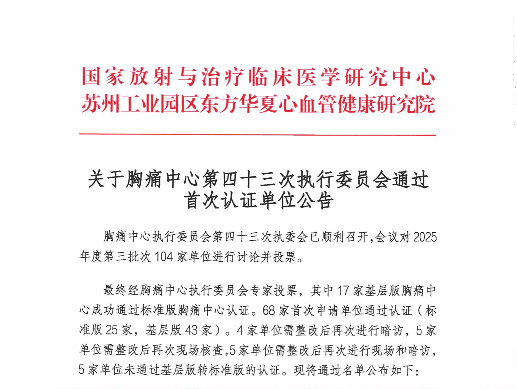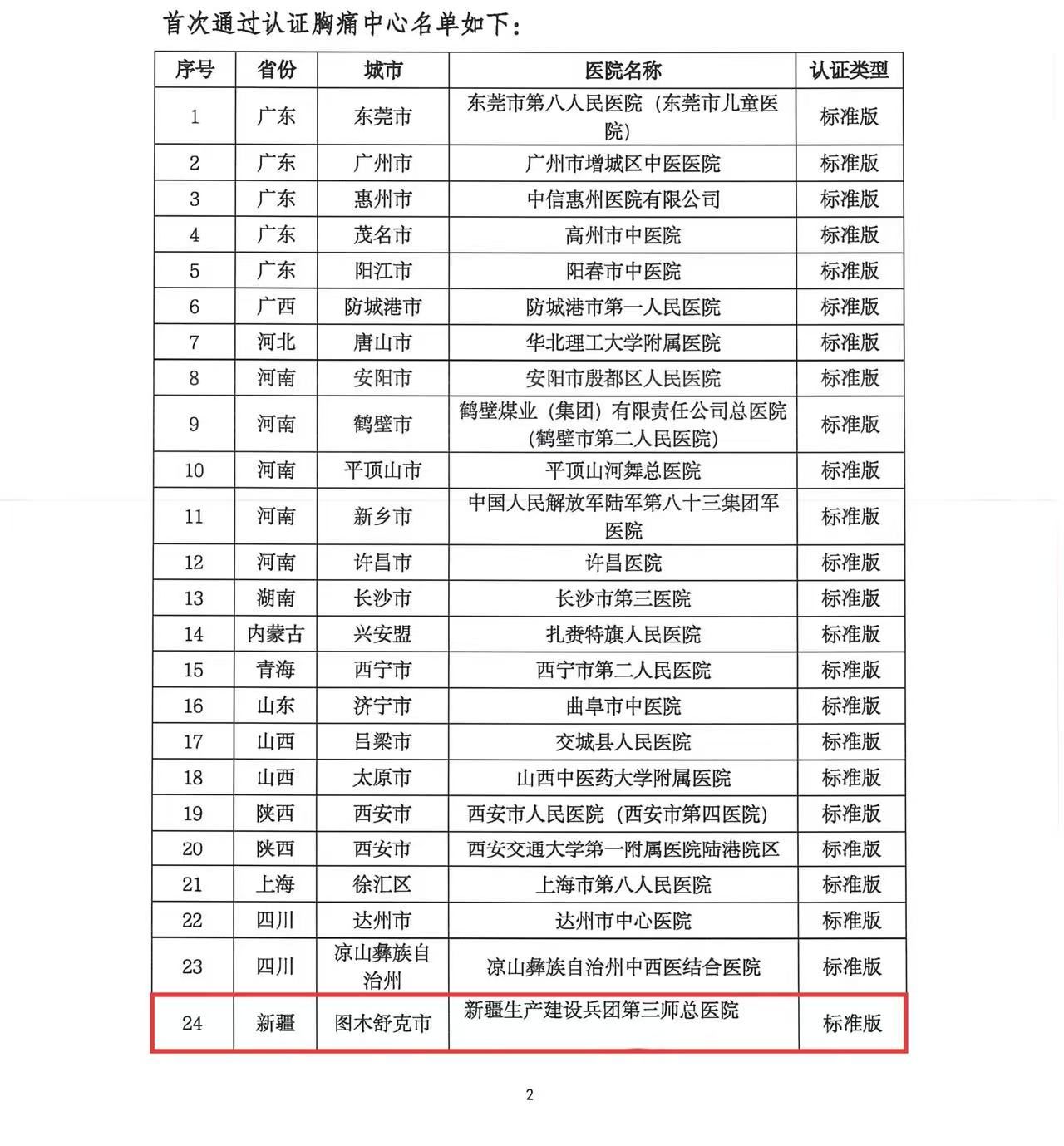 2026年2月4日,国家胸痛中心执行委员会公布《关于胸痛中心第四十三次执行委员会通过首次认证单位公告》,第三师图木舒克市总医院正式通过国家标准版胸痛中心认证,标志着我院在急性胸痛救治领域迈上了新台阶,为辖区内胸痛患者提供更加高效、规范的诊疗保障。