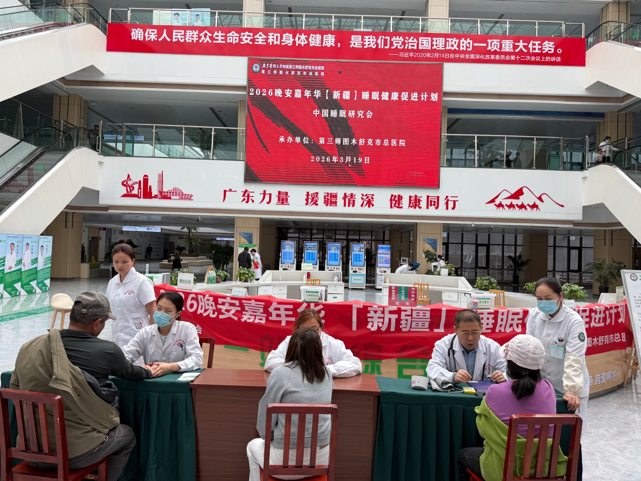 2026年3月19日,在世界睡眠日来临之际,第三师图木舒克市总医院组织开展以睡眠健康为主题的多学科联合公益义诊活动,吸引众多居民前来咨询与参与。来自神经内科、中医科、康复医学科、呼吸内科、精神心理科等多学科的专家团队齐聚现场,为大家提供一站式、全方位的睡眠健康服务,帮助居民深入了解睡眠障碍的成因与应对策略,切实提升睡眠质量。