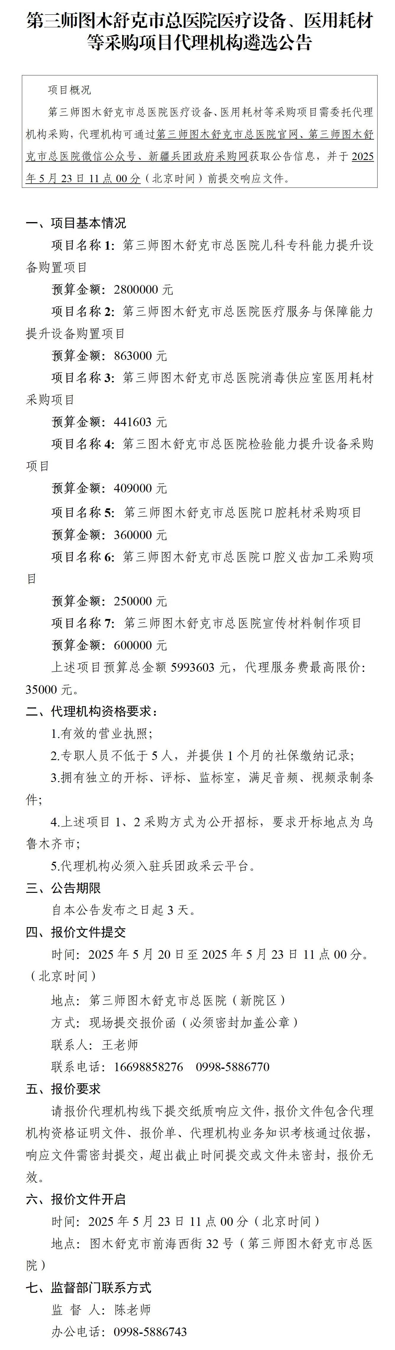 第三师图木舒克市总医院医疗设备、医用耗材等采购项目代理机构遴选公告